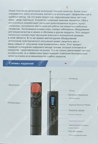 2. Технические возможности: | поиск скрытых шпионских мини видео камер, GSM, WIFI прослушки, радио жучков; сигналов и магнитного поля GPS трекеров слежения. |
