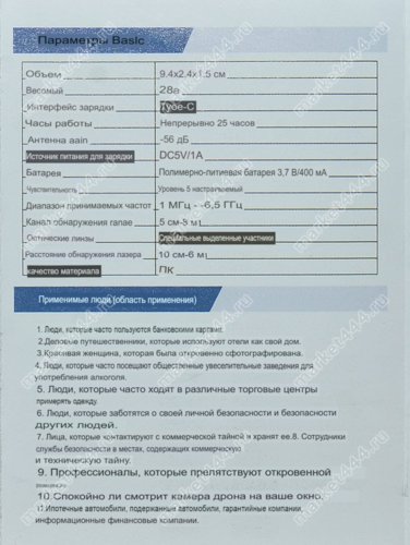 3. Применение: | обследование помещений, автомобиля и пр. с целью исключить возможность получения злоумышленниками получение информации конфиденциального характера и компрометирующих материалов. |