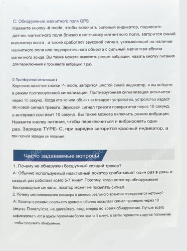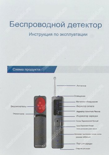 Режимы работы, поиска | 1) Электромагнитному излучению. 2) Магнитному полю. 3) Визуальный поиск скрытых микро видеокамер при ИК. 4) Фонарик. 5) Противоугонная сигнализация. |